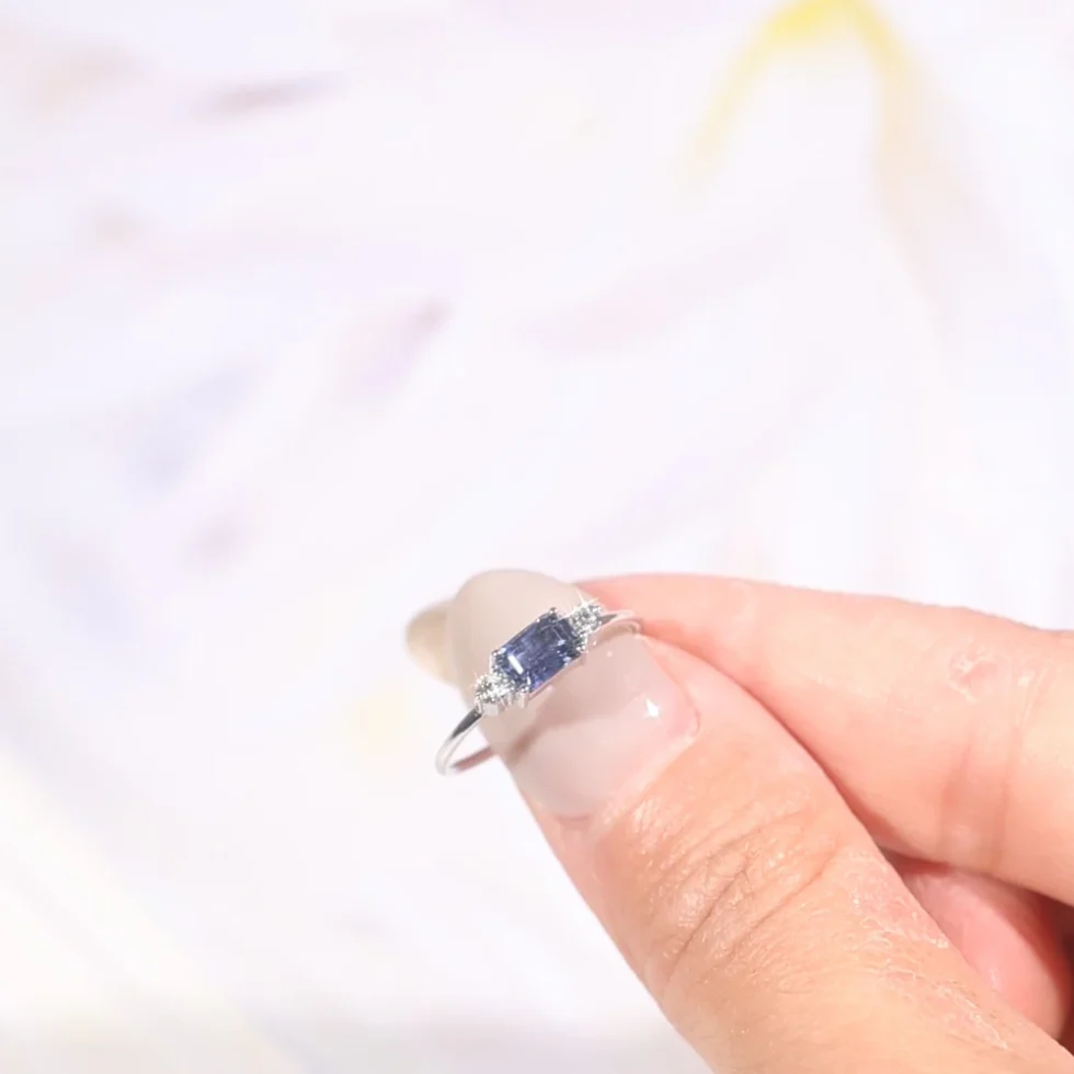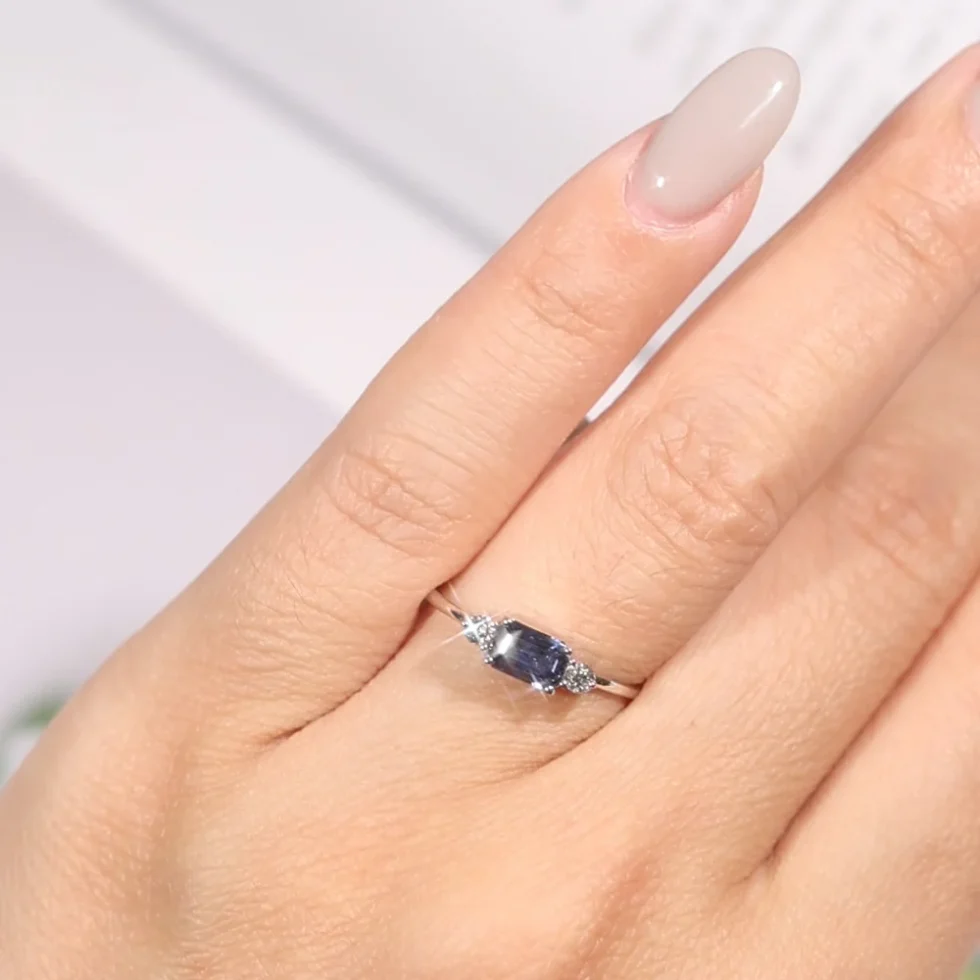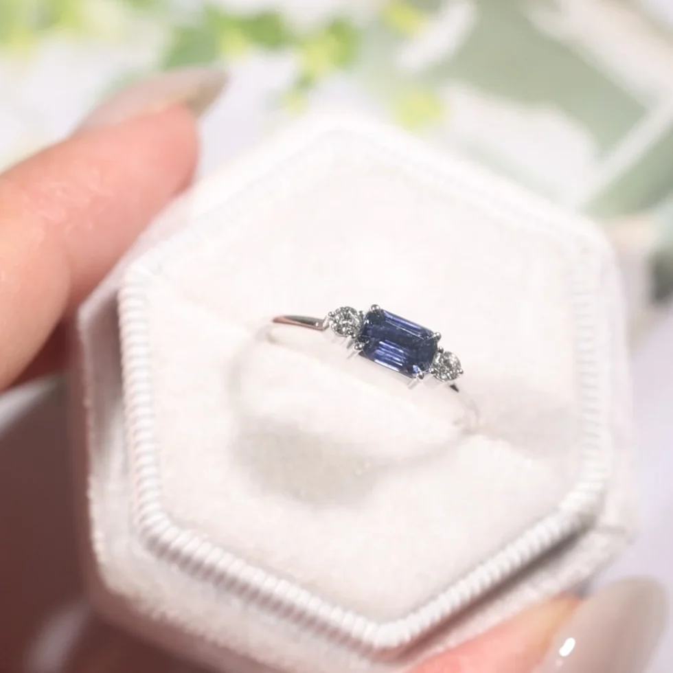 • Center Stone: One natural emerald-cut blue sapphire (6×4mm, approx. 0.73cts) with rich, velvety tones