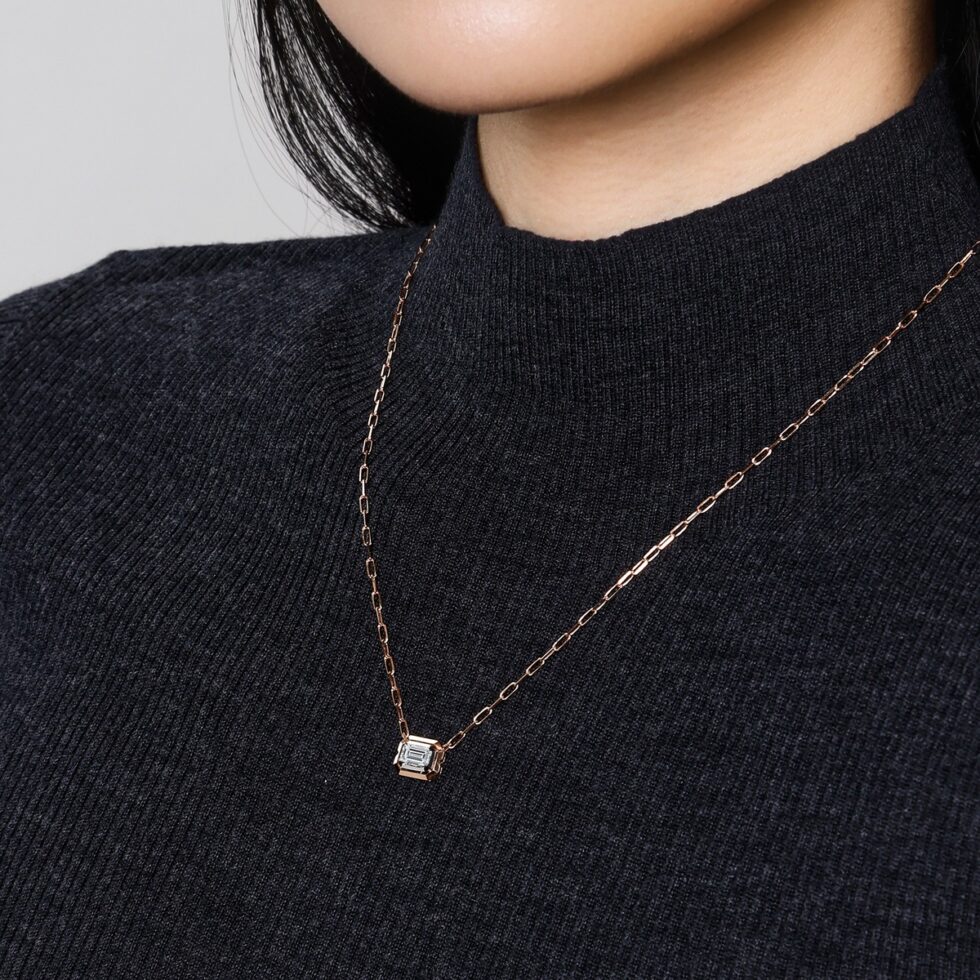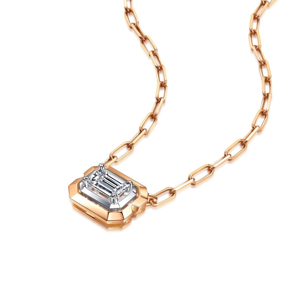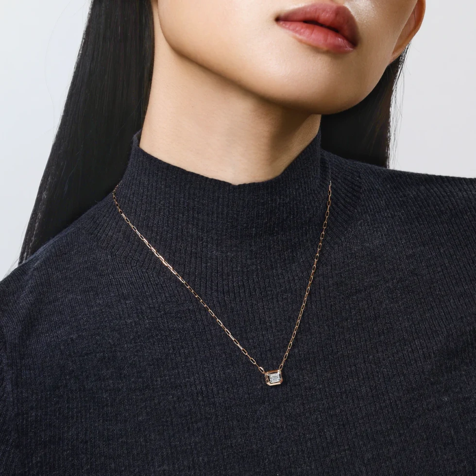 A refined 18K white and rose gold necklace featuring a single 0.42ct emerald-cut diamond of F color and VVS2 clarity, blending timeless elegance with modern sophistication.