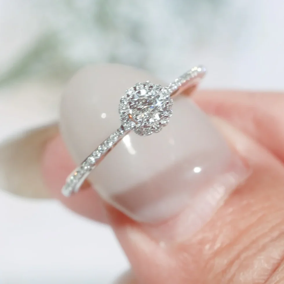 The Lumière Halo Diamond Ring captures light in every angle, featuring a cluster of natural diamonds embraced by a pavé double halo, delicately set in 18K gold for timeless brilliance and elegance.