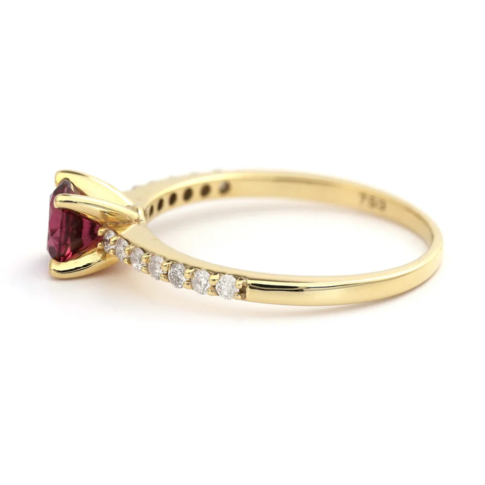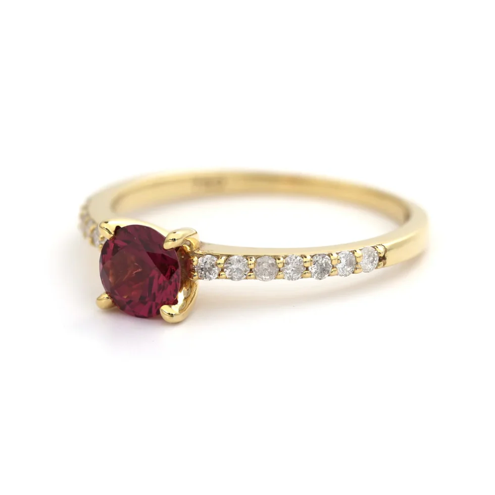 Rare, radiant, and remarkable,  this ring features a vivid AAA-grade rhodolite sourced from Tanzania, admired for its rich raspberry hue and velvety brilliance. Framed by pavé-set round diamonds and crafted in glowing 18K solid yellow gold, it’s a statement of refined taste and timeless artistry.